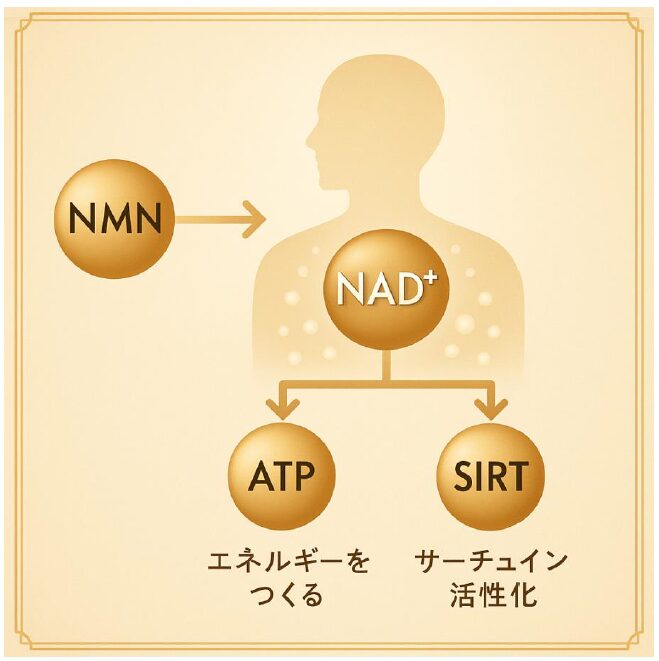 NMNは体内でNAD⁺へ変換され、細胞修復やミトコンドリア機能の維持など、年齢とともに低下しがちな機能をサポートするとされています。